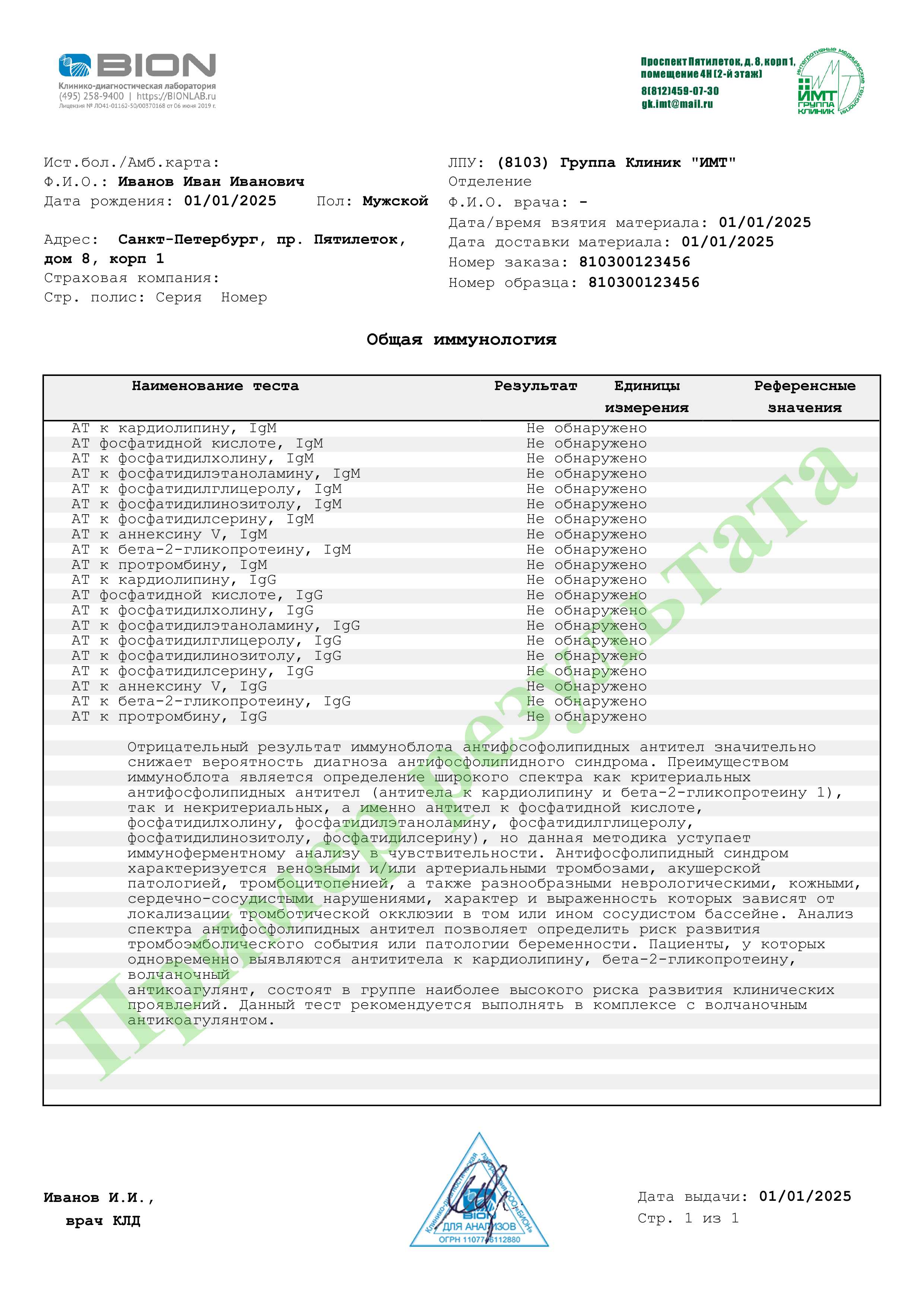 Панель антифосфолипидных антител (к аннексину V, бета - 2 - гликопротеину, протромбину, кардиолипину, фосфатидной кислоте, фосфатидилхолину, фосфатидилэтановамину, фосфатидилглицеролу, фосфатидилинозитолу, фосфатидилсерину) IgM, IgG (дот-иммуноанализ)